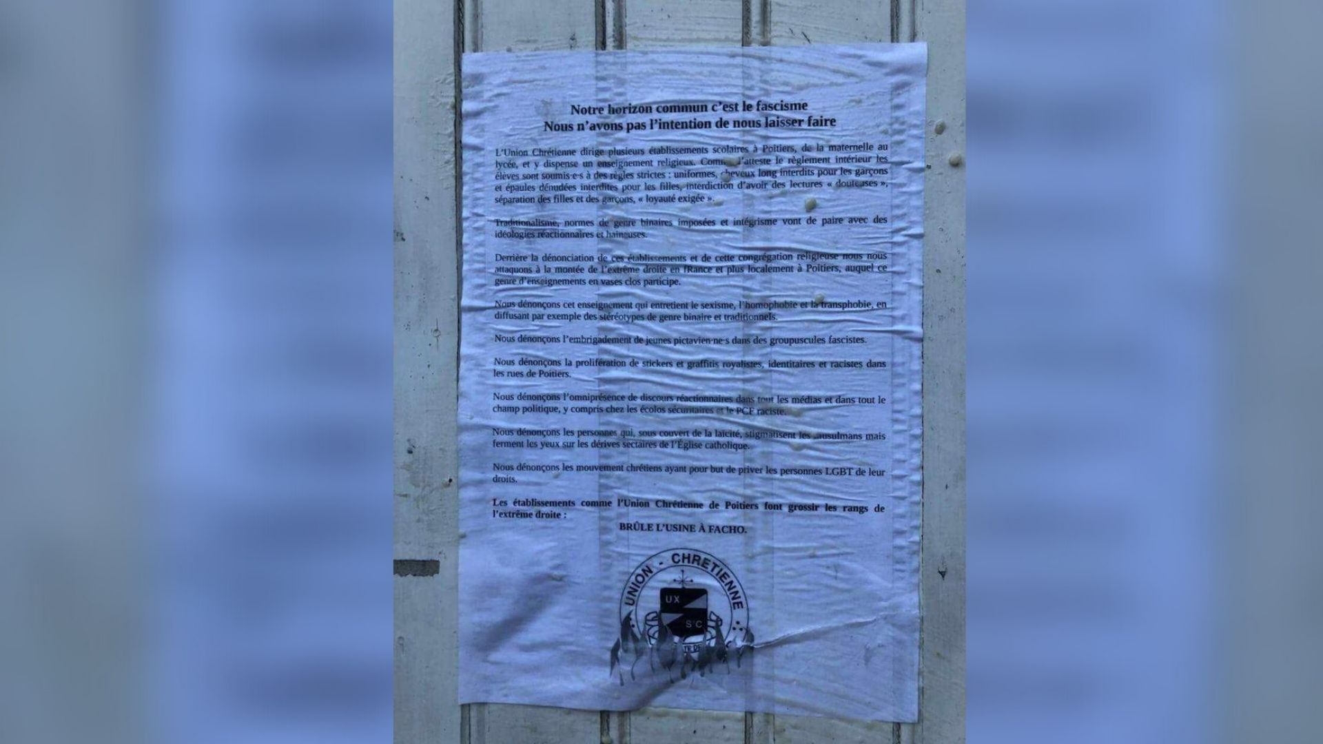 Un texte haineux, incohérent et, pour tout dire, stupide et qui se termine par un appel à brûler « l’usine à fachos ».
