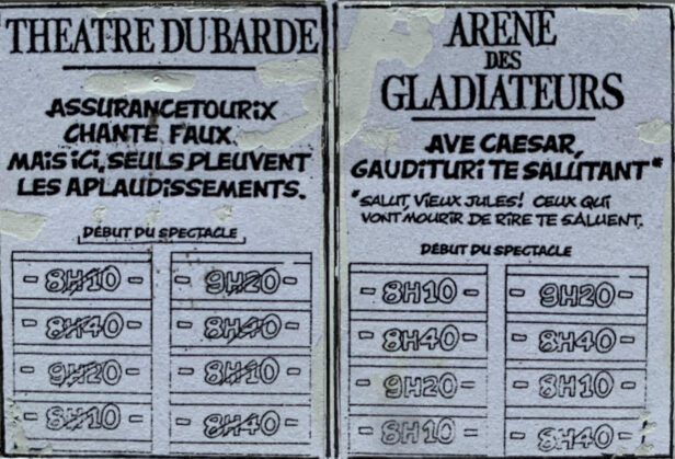 Dernière performance, le Parc Astérix. Ouvert il y a 36 ans (1989), Albert Uderzo en était le directeur artistique. J’ai eu l’honneur de le rencontrer et d’être chargé d’écrire les quelques centaines de panneaux de la signalétique. J’ai essayé de m’adapter à l’esprit et ai utilisé le latin sous-titré en français… (voir l’image ci-dessous). Quant à la vie riche d’Albert Uderzo, c’est encore toute une histoire !