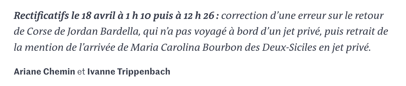 En pleine nuit, Le Monde a alors discrètement amendé son article mensonger : « Rectificatif le 18 avril à 1h10 : correction d’une erreur sur le retour de Corse de Jordan Bardella, qui n’a pas voyagé à bord du jet privé de Maria Carolina Burbon des Deux-Siciles. » Faute avouée à moitié pardonnée ? Pas exactement, puisqu’une autre contre-vérité s’était glissée dans le papier. Une seconde modification a ainsi été apportée, quelques heures plus tard : « Rectificatifs le 18 avril à 1h10 puis à 12h26 : correction d’une erreur sur le retour de Corse de Jordan Bardella, qui n’a pas voyagé à bord d’un jet privé, puis retrait de la mention de l’arrivée de Maria Carolina Bourbon des Deux-Siciles en jet privé. » Décidément, quand ça ne veut pas, ça ne veut pas.