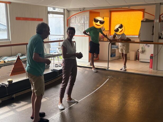 Chaque boule pèse entre 1,2 et 1,4 kg et tout l’art consiste à joindre la bonne charge à la bonne poussée. « C’est très technique », concède Bernard, qui pratique ce sport depuis 30 ans… on ne le contredira pas ! Il nous apprend que si la boule passe entre le maître et une autre boule, elle « passe en maille », et lorsque la boule est lancée, les joueurs lanceront pour rire à celle qui n’a pas assez de charge « regarde pas derrière » ou « ne lui parle pas », façon de conseiller à sa boule de ne pas ralentir. Dans leur jargon, il convient de dire que « ça a bonne mine » si c’est bien joué ou « ça boit ça mange » si ce n’est pas mal. Pour notre part, les essais manquaient largement de charge, mais cette immersion au sein de l’association nous a permis de découvrir une activité vraiment joyeuse, locale et familiale.